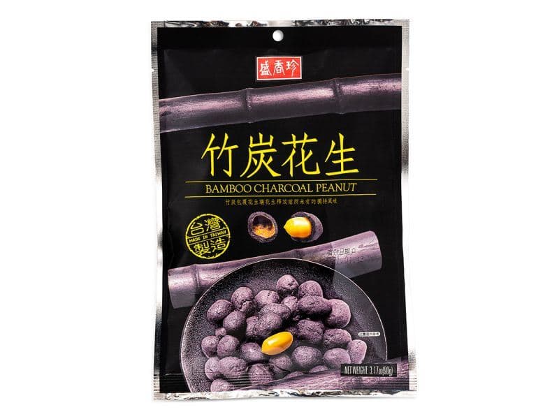 Cacahuètes (86%), farine de blé, sucre, poudre de charbon de bambou (1%).