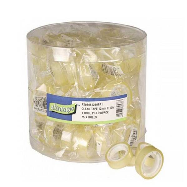 Tub of 75 clear mini sellotape rolls. Size: 12mm X 10m.