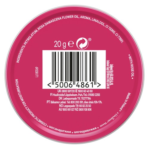 This Vaseline Lipbalm lip Therapy Rosy Lips tin is clinically proven to help heal dry lips, This lipcare product instantly softens and soothes dry lips and leaves a sheer pink tint and rosy glow, This lip care is made with triple-purified Vaseline Petroleum Jelly, rose oils and sweet almonds, This lip salve has a light rose fragrance and helps to soothe chapped lips, This cocoa lip balm is non-sticky, non-greasy formula locks in moisture, Collect all products from the Vaseline Lip Therapy lip tin range: Original, Cocoa Butter, Aloe Vera and Rosy Lips