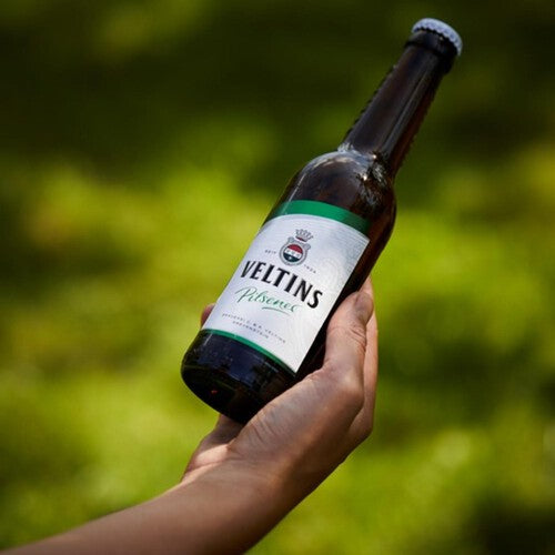Veltins Pilsener is a celebrated German Premium Pilsener, upholding complex brewing traditions since 1824. This bright, shiny golden lager presents a light, yet appealing fruity aroma upon serving. It is known for its distinctive profile, combining a fine, dry bitterness with a crisp, tangy character throughout the entire drinking experience.