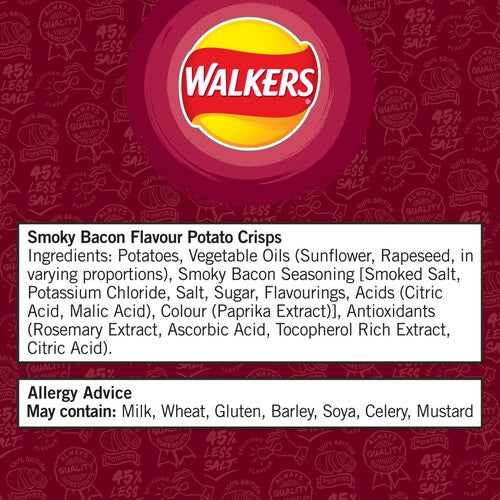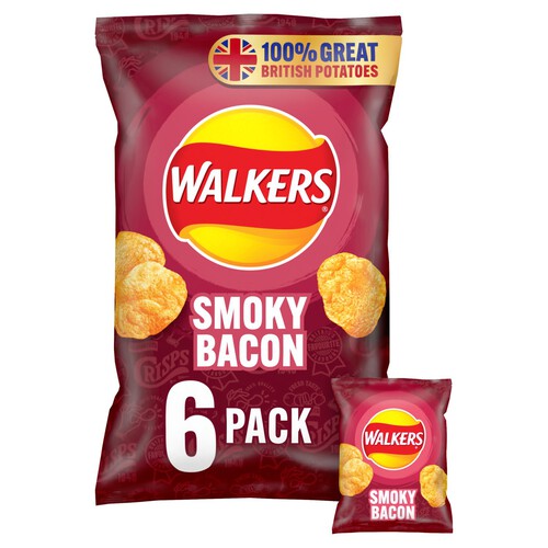 Enjoy the classic savoury taste of Walkers Smoky Bacon in this convenient multipack format. Each purchase provides six individual bags, perfect for portion control throughout the week. These popular crisps are consistently made with potatoes sourced from Great Britain for a trusted standard.
