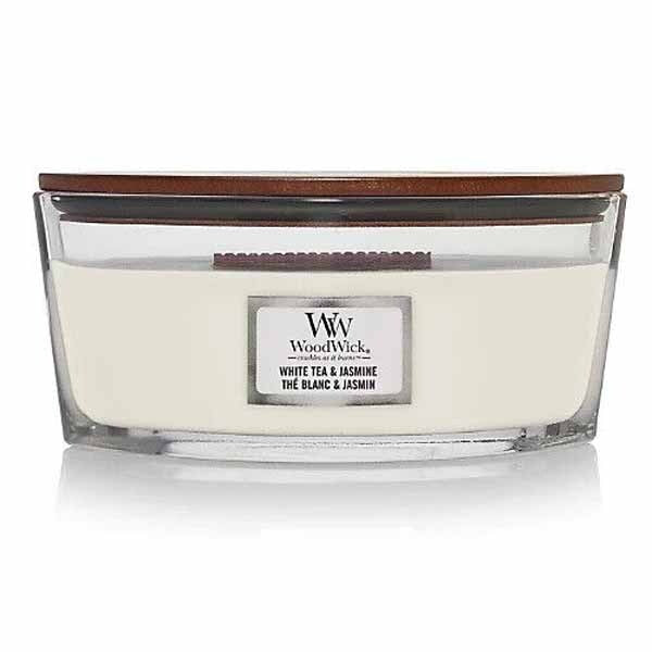 Informations produit : Bougie Woodwick grand format elliptique au thé blanc et jasmin 454 g (16 oz) alliant le parfum floral délicat du jasmin à l'essence apaisante du thé blanc, créant ainsi une fragrance élégante et relaxante qui emplit votre espace de sérénité.